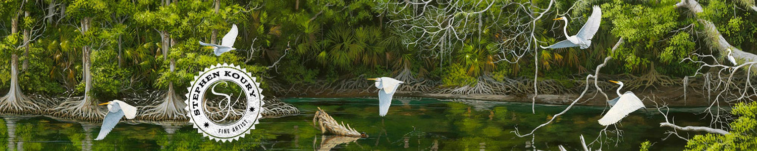 After coaching at Florida Southern Stephen turned his underlying passion for painting into a way of life. His artwork blossomed and the paintings that followed were testaments to his reaching a new level of mastery of the art. Koury's works have since shown in numerous galleries, museums, and one-man-show exhibits around the globe. Stephen has led African and Central American Photo safaris, was named Florida's Ducks Unlimited Artist of the year three times, and authored his first book, the very successful "Painting Natures Little Creatures", for Northlight books. The book led to teaching workshops, the most recent of which was at the New York Botanical Gardens. Stephen's works can also be found in another book, "Wildlife Art; 60 Contemporary Masters and Their Work".