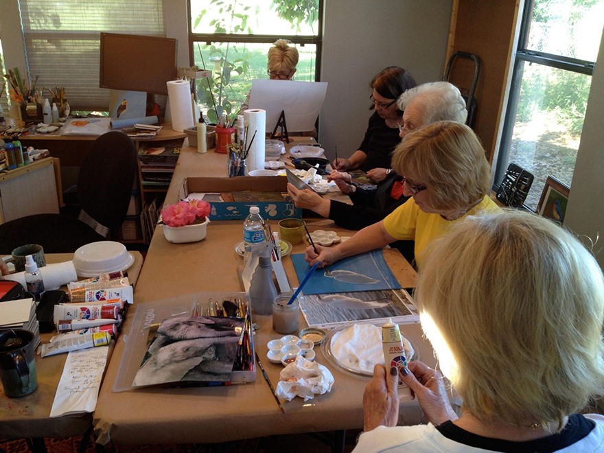 Once you have the basic techniques down, we’ll move into rounding objects (whether it’s fur or feathers.) Then, you’ll practice painting a critter of my choosing (with your input.) I want you working on something within your reach. These workshops are about success…not frustration to the point of giving up. When my students work on things that they are ready for, they experience success, which naturally leads to them growing as an artist. The balance of the class will be honing these important skills and discussing art concepts and the business of art. Bring your questions, because there are no secrets here! Returning students that demonstrate a good grasp of technique can choose their own subjects. From there, they learn the secrets of painting realistic feathers, fur, wet and dry skin, landscapes, ground shots, and lots more. In the end, I truly love teaching these workshops and I look forward to seeing you there!