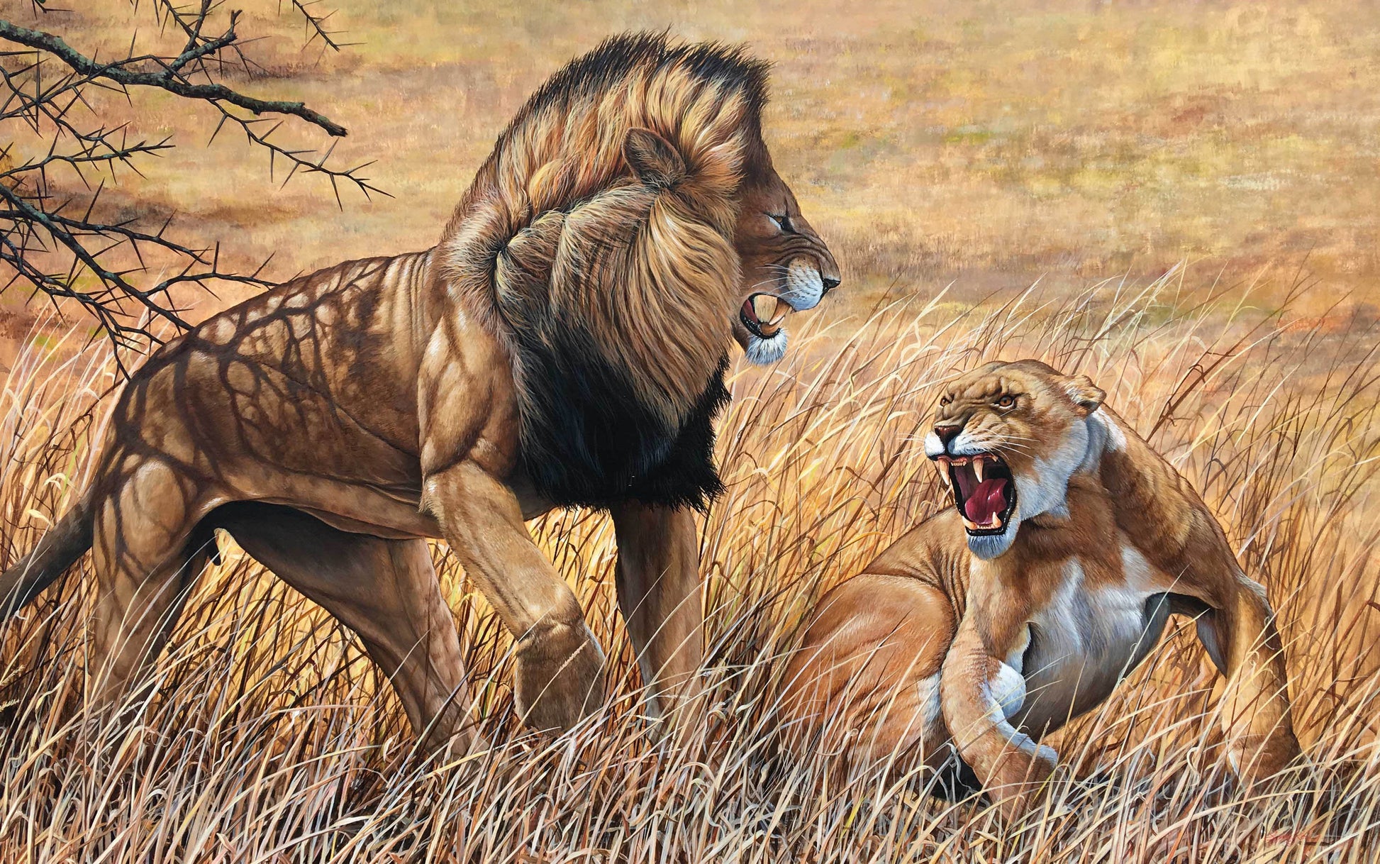 This scene is my attempt to convey the sights, sounds, and emotions of African Lions courting and mating. The sound is unbelievable,one I will never forget, growls and purrs that echo thru the bush. The emotions are high and to the casual viewer you would think one minute they really like each other and the next they really don't. The male has to uncouple and get away before being smashed in the face by the female and moments later she is rubbing and nudging him affectionately. This process goes on for hours and hours, it's a truly awesome sight!
