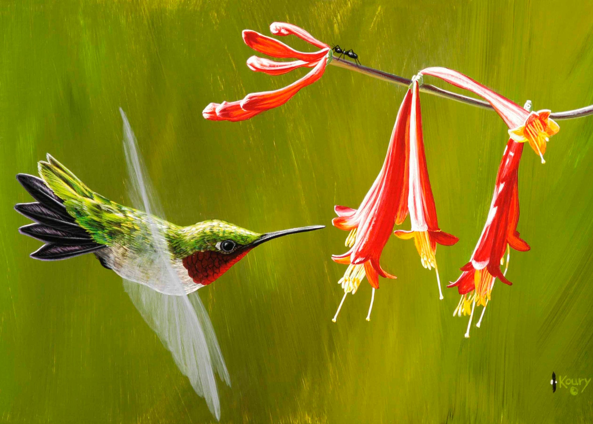 This painting depicts the hummer that I see the most in the fall and winter here in Florida. Our yard is loaded with flowers specifically to attract these guys and butterflies. The Coral Honeysuckle is a special favorite of all the Hummingbirds but this male spends all his time defending it.